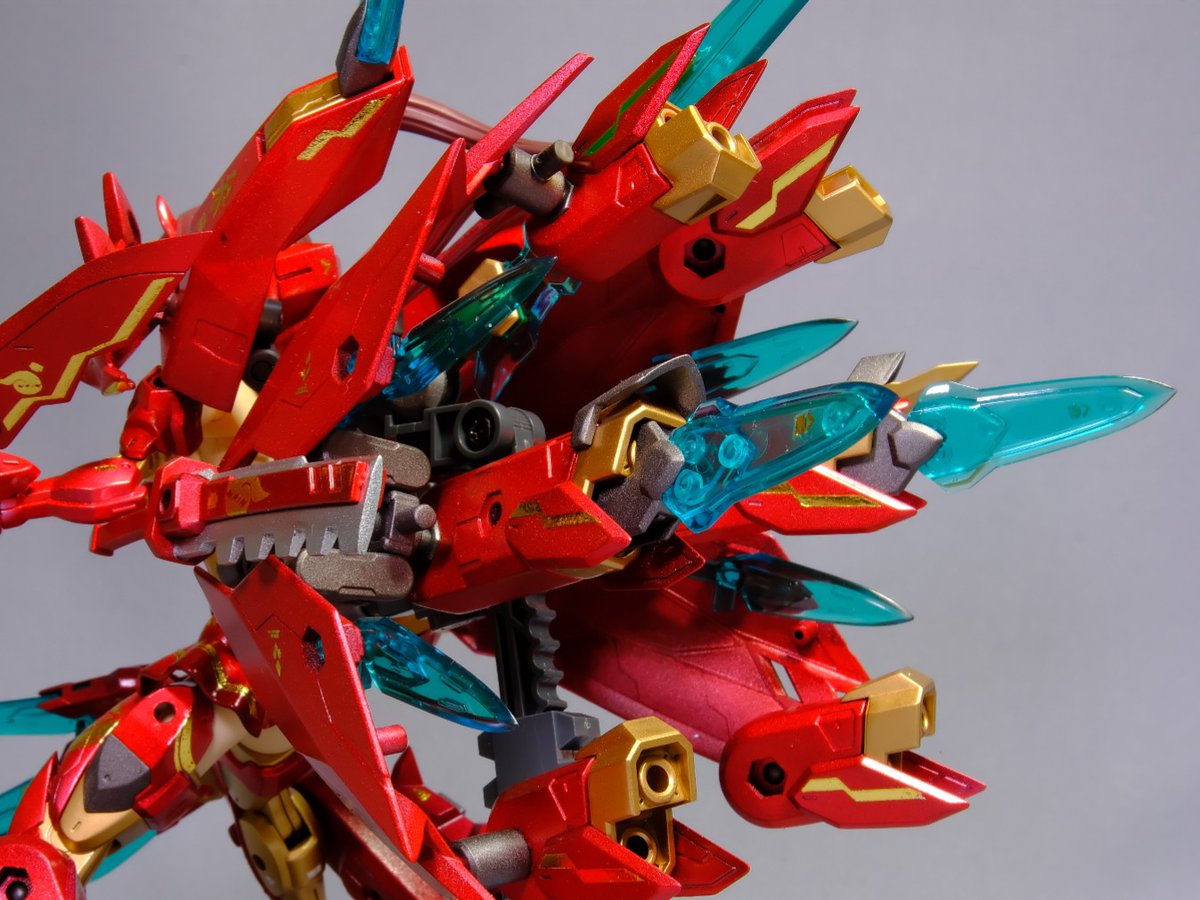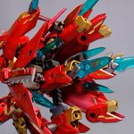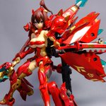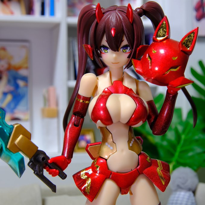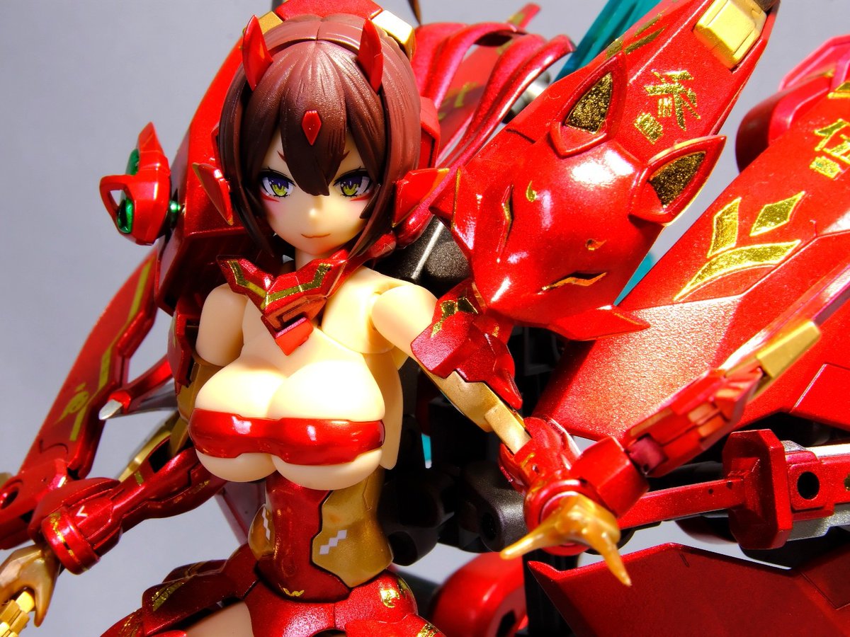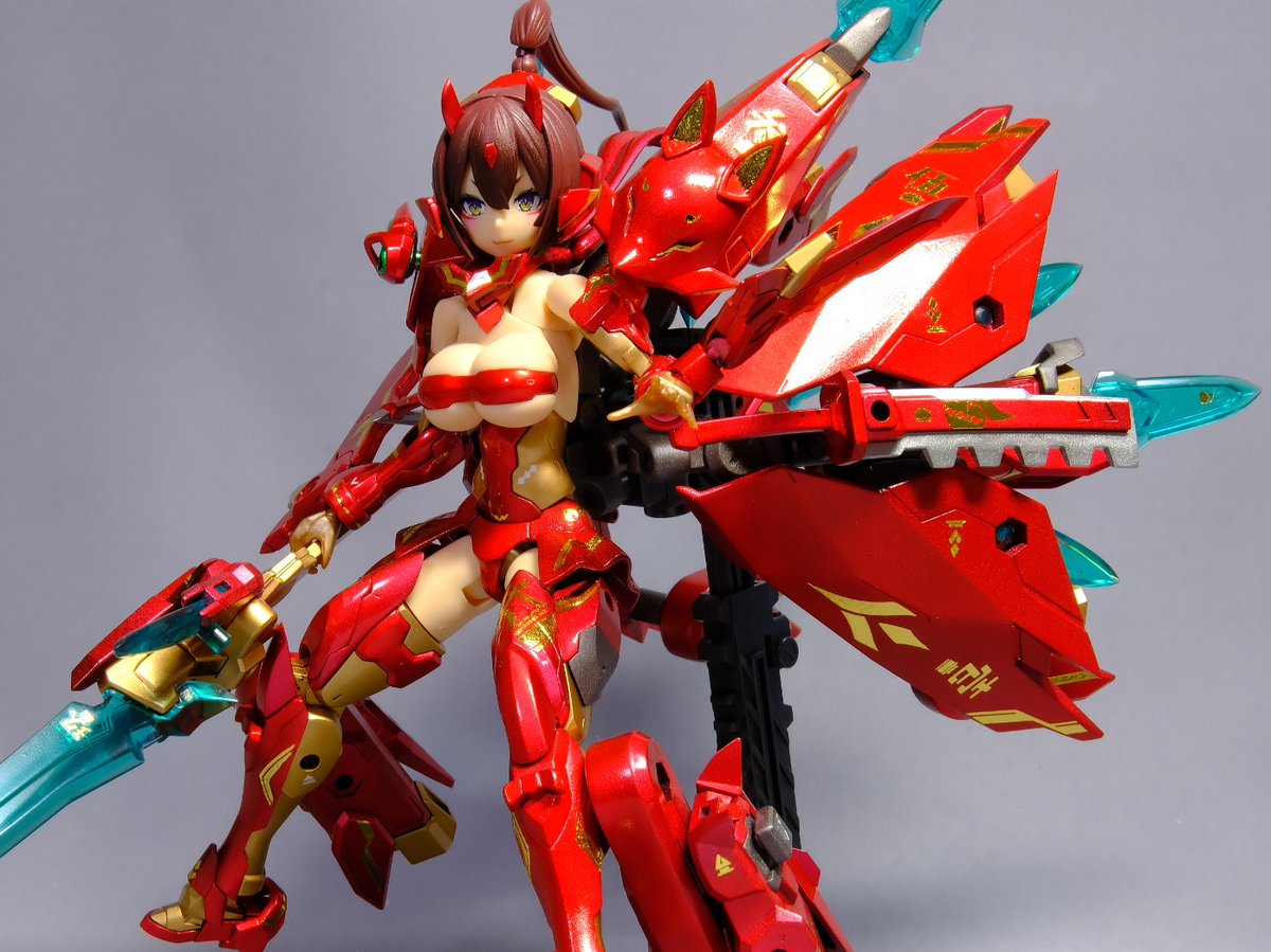 赤いきつね(朱羅 九尾 火舞羅)。 こうなると緑の何かが欲しいよね🤣 金色のデカールは色々と失敗。 左右間違えたり、そもそも貼る前に表面処理の必要性有り。 これ、M.S.Gラピッドライダー(バイク)の部品だよな…柄なんてハンドルだし😅 #メガミデバイス