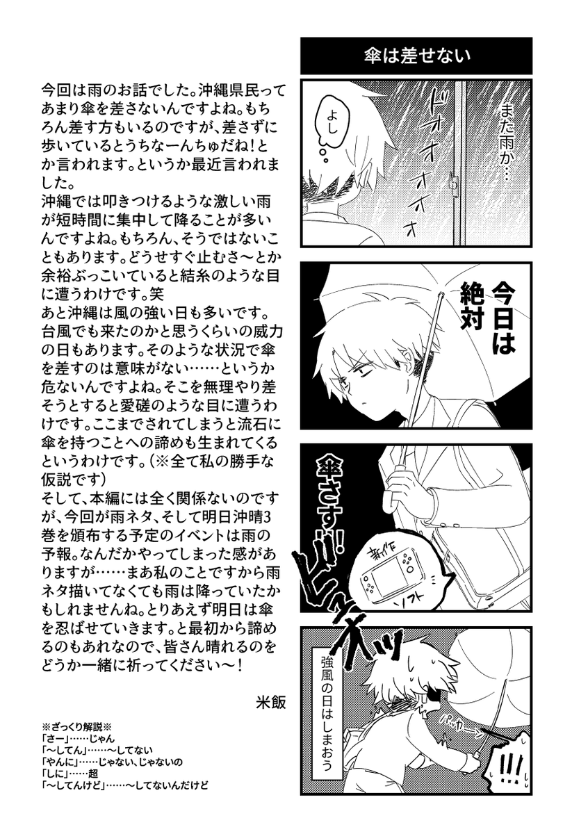 【沖縄創作】#34【沖縄ぬ未来や晴りやいびーるはじ!】 傘の話 お知らせ 5/7より沖晴3巻紙版&DL版販売開始します!よろしくお願いします! pixiv.net/artworks/10702… #08キャラ #沖晴