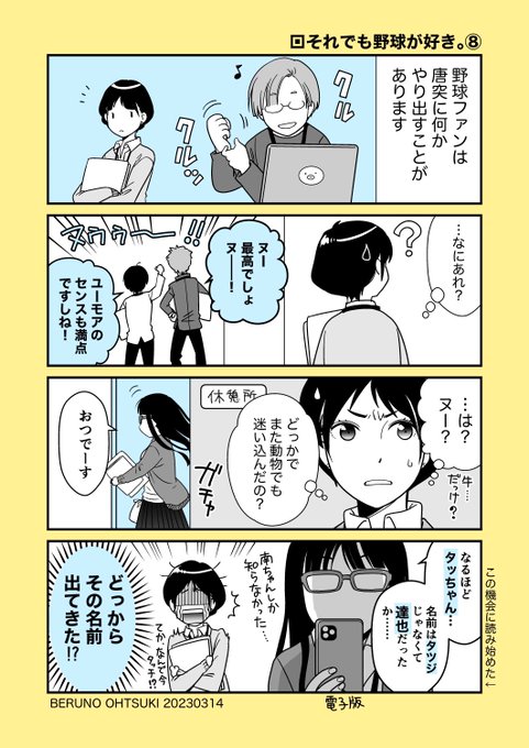 2 2 それでも野球が好き。【16】【17】【18】 現在、3/15 WBC準々決勝・キューバvsオーストラリアを観にきた会社員メガネ2人の話(どんどん雑になるあらすじ) …2人? #創作漫画 #WBC #侍ジャパン バックナンバーはプロフ画面から『メディア』タブで絞っていただくと、多少探しやすいかと思います… 23/03/26 14:21