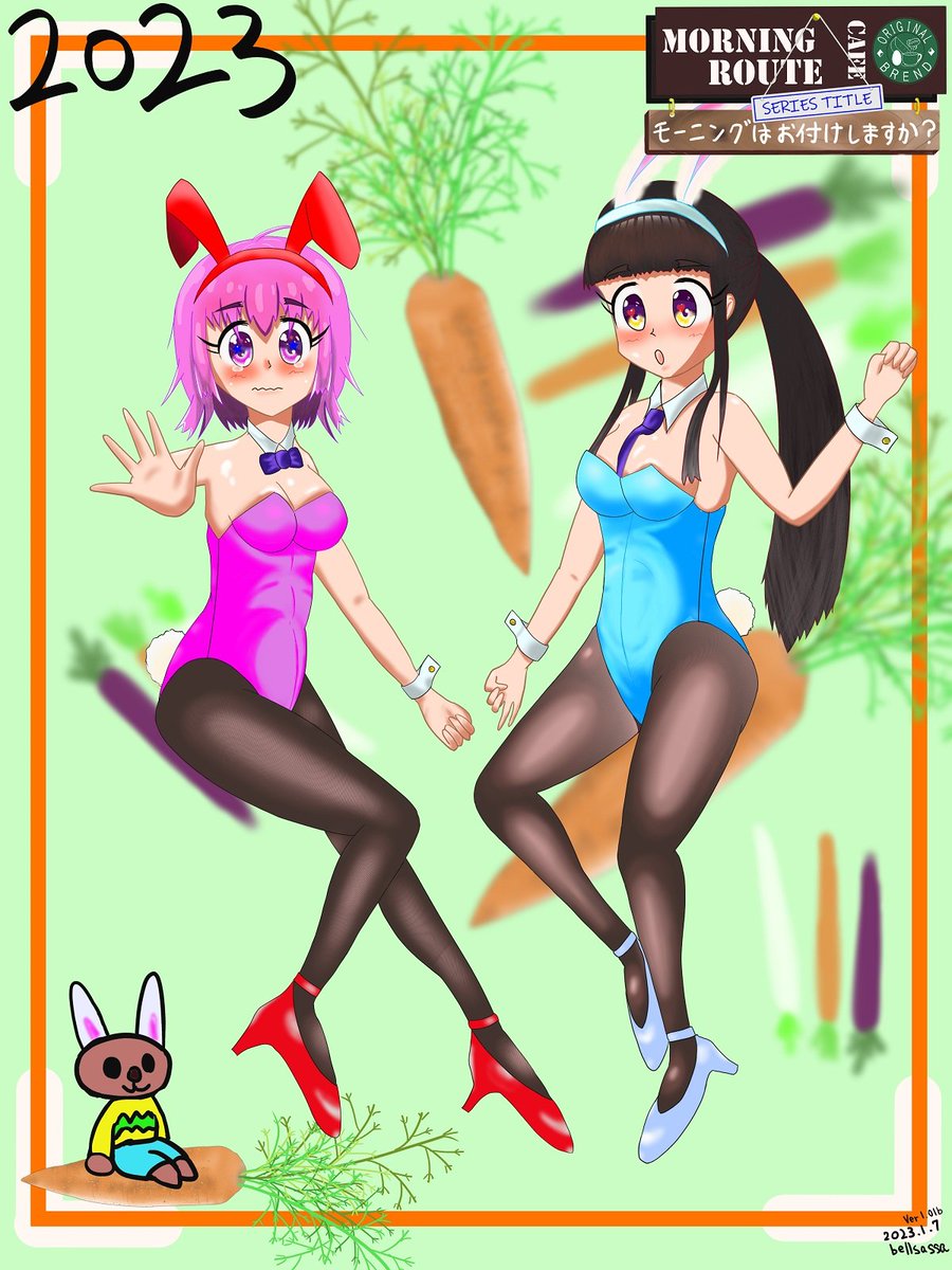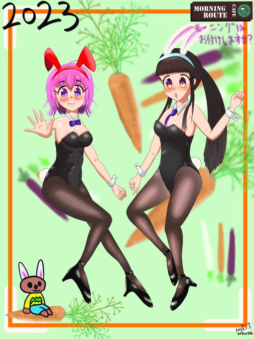 おはようございます 年賀絵できました! (らくがき~約15h?) オリジナルのひより👩ほのか👧です☕️ バニースーツ可愛くできたと思います リアルな🥕とふたりの目の中に注目! #年賀状イラスト2023 #オリジナルイラスト #イラスト好きな人と繋がりたい #絵描きさんとつながりたい