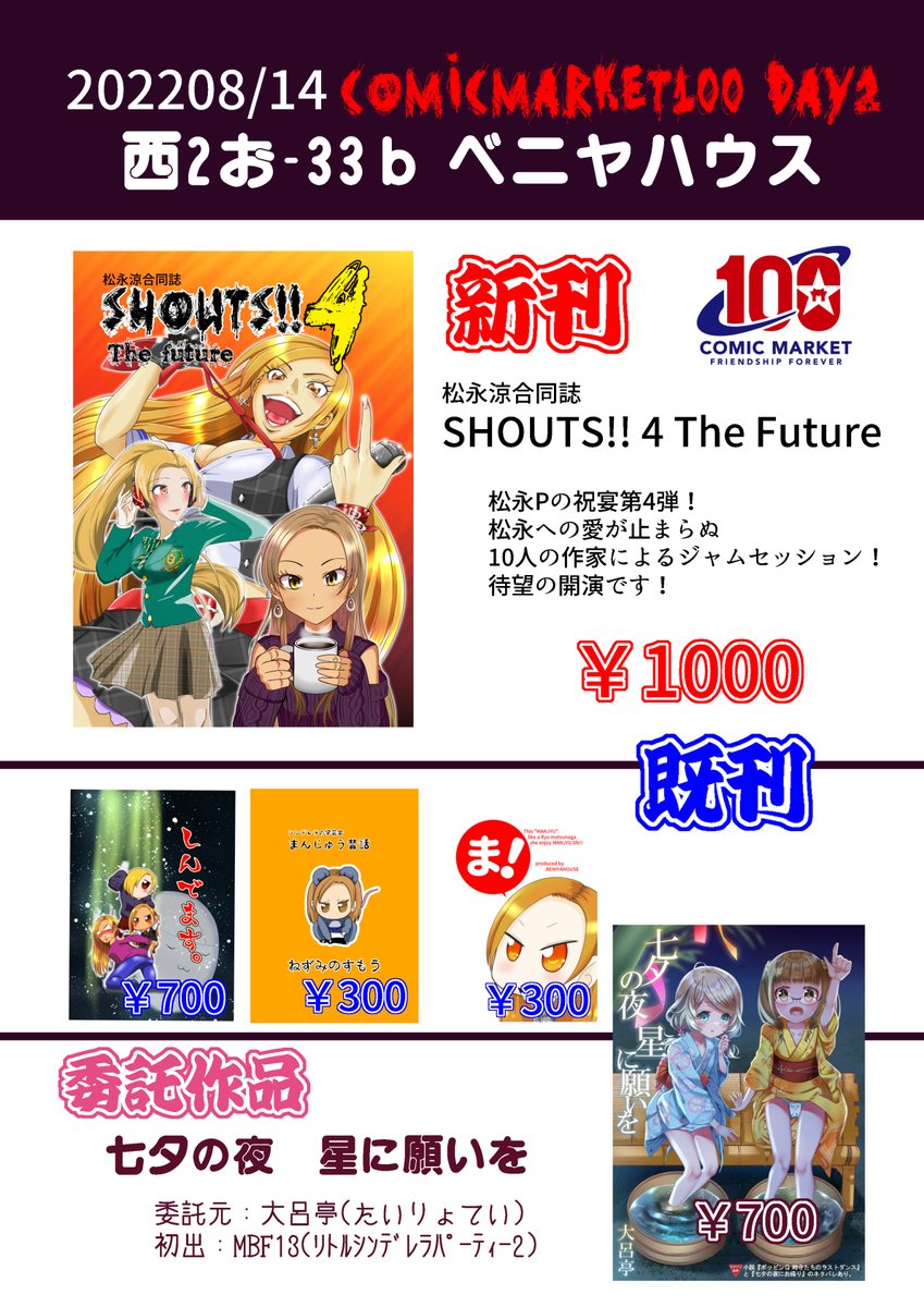 25 35 【告知】8/14コミックマーケット100、西2お-33b『ベニヤハウス』新刊、「Shouts!! 4 The Future」頒布! 今回も松永を愛する10名がそれぞれの松永涼を描きました!(うちはいつも通りこんな感じ) 頒布価格は¥1000 メロンさんでも取り扱いが決定しましたのでよろしくお願いいたします! 22/08/05 22:43