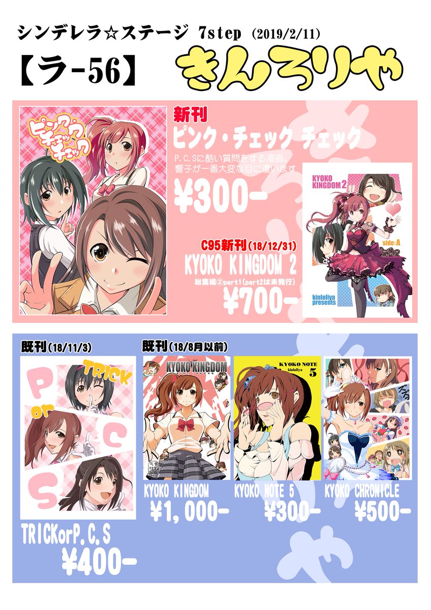 11 17 シンステ7【ラ-56】きんろりや お品書きです。 新刊は響子の顔芸漫画です。P.C.Sが芸人だったら響子は間違いなくツッコミ。 19/02/09 00:14