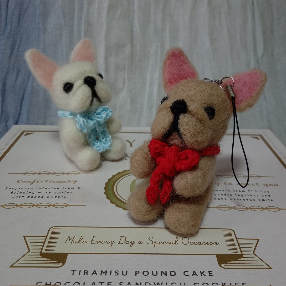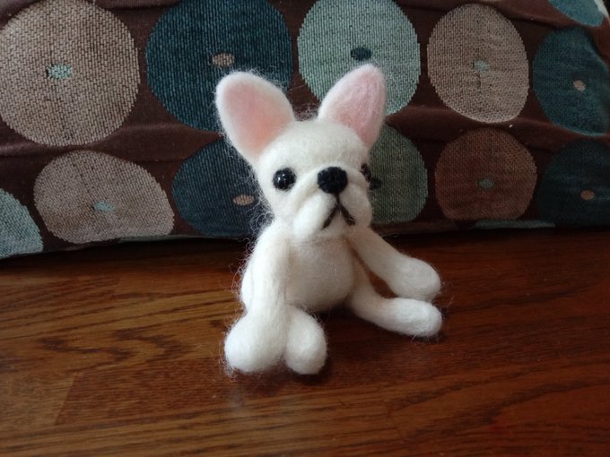 0 9 ベージュのフレブルを作る前に、白のフレブルを試作として作りました。 ベージュのフレブルには赤いリボン。白のフレブルには刺繍糸で水色のリボン。刺繍糸は光沢があって綺麗です。 #ハンドメイド #羊毛フェルト #フレブル #フレンチブルドッグ 22/04/14 12:21