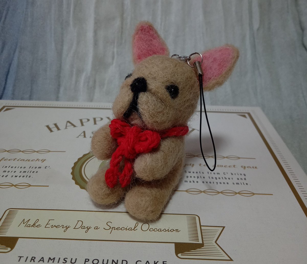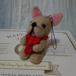 0 9 フレンチブルドッグのストラップを羊毛フェルトで作りました。バッグに入れて持ち歩きたいとのご注文。コアメイク・テクニックで作ることにした。さし固めるのもいつもより強く、丈夫に作る。 赤いリボンをつけて可愛くなりました。 #ハンドメイド #羊毛フェルト #フレブル 22/04/10 11:12