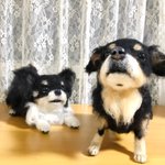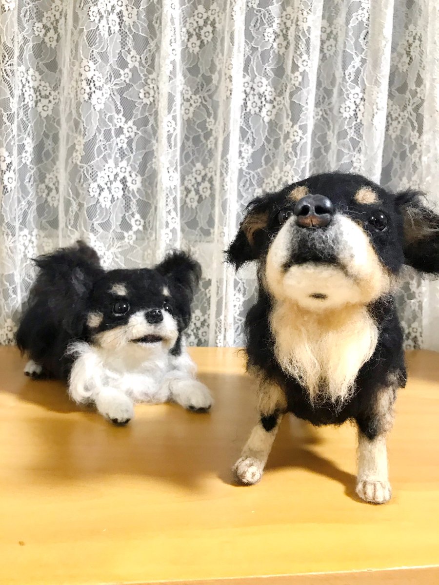 こちらは我が子 ベリーとマリン ベリーは練習で何匹も作ってくれたので 初期の頃から比べると面白いです #羊毛フェルト #チワワ #チワックス