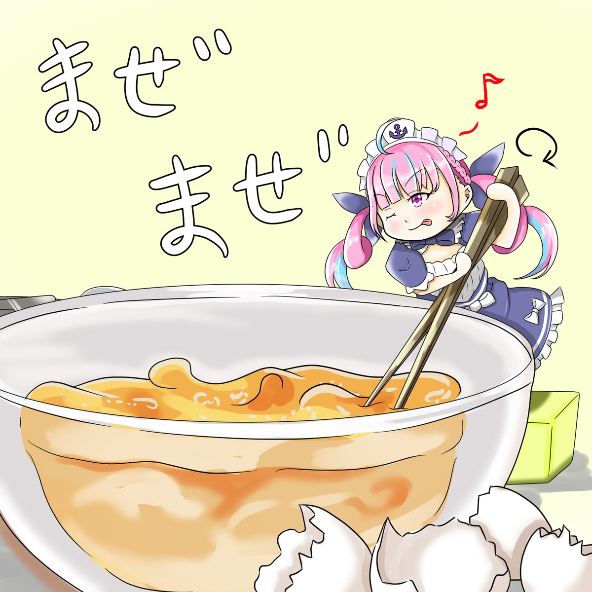 #あくあーと #イラスト練習中 ちびあくたんが 何かを作っているぞ! 今度は卵をよくかき混ぜている。 バターはこの後使うみたい。 ヽ(^。^)ノ<がんばれ!