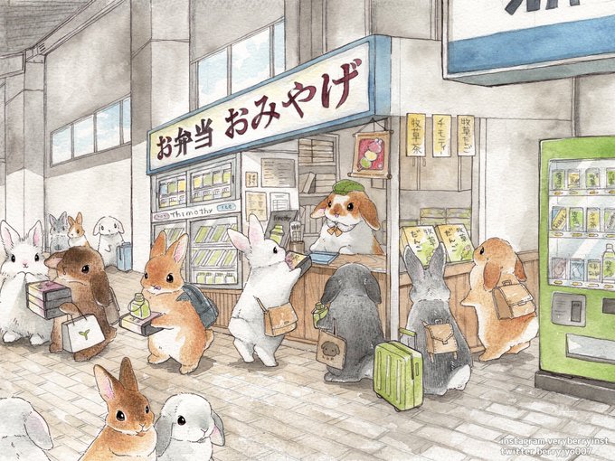 〜うさぎさんのお盆〜 新幹線ホームは大混雑! 売店に並んでお弁当を買うよ 駅弁には牧草茶も付いてくるみたい♪ プルルルルル… 急いで急いで!! 新幹線に乗り込みます
