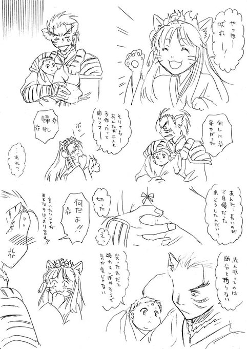 お題【我が子】 謎のモヒカンにお夏を奪われて意気消沈してた御鏡家の吠丸ですが、アンチ一族急先鋒だった彼も二度の交神を経てすっかり親バカになり果てたという落書き漫画。 #俺屍週ドロ