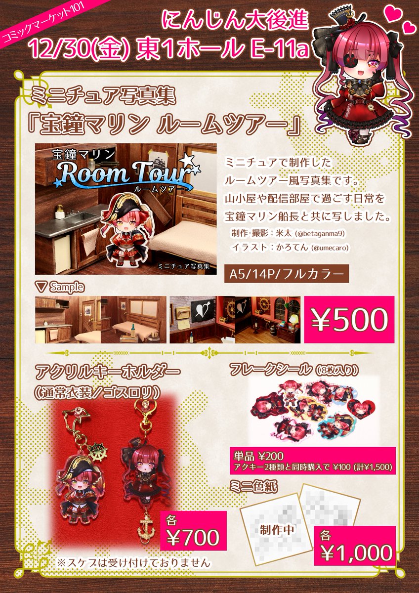#C101お品書き 2022年冬コミお品書きです。 新刊(はじめて)は宝鐘マリン船長のミニチュア部屋本で グッズはアクキー&フレークシールです。 ミニ色紙はかろてんさんが書けたら持っていきます。 東1ホールE-11aにてお待ちしています。 #C101