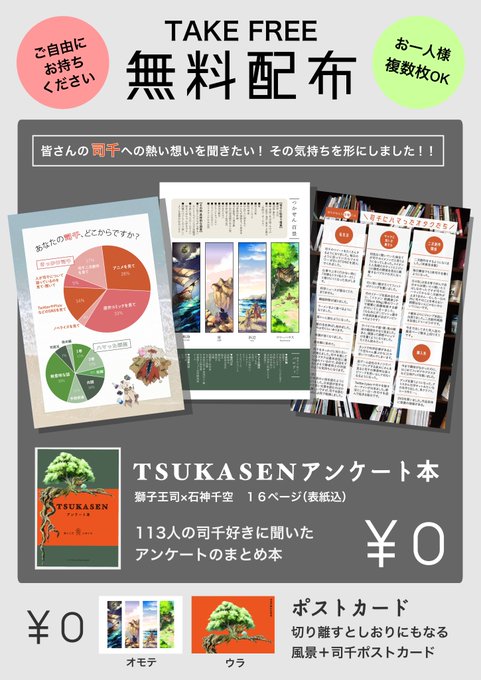 【司千アンケート本】 皆さんからお聞きした司千に関するアンケート結果をまとめ、イベント無料頒布いたします! A5サイズの16ページ、両面ポストカードもご用意しました。8/22の大阪インテにて初頒布です!遠方の方でも手に取れるように通販も予定しております! #dcstイベントここに出る_サークル
