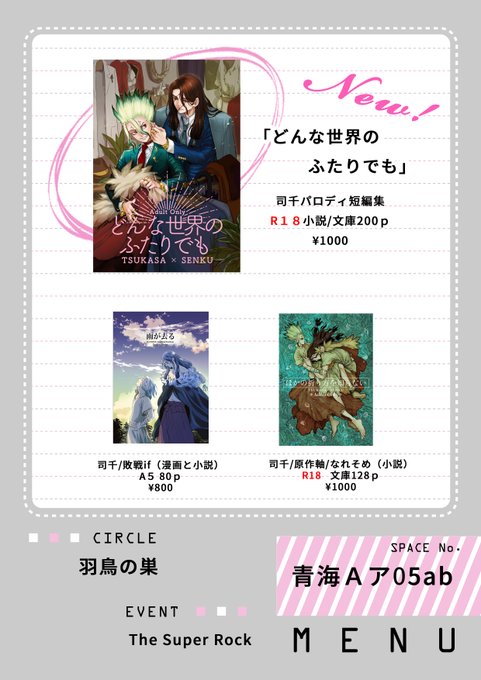 3/19 The ROCK12 司千プチオンリーに参加します!よろしくお願いします~!すべて司千です!新刊あります! 【スペース:東2ハ05a】 【サークル名:羽鳥の巣】 #司空0319 #dcstイベントここに出る_サークル