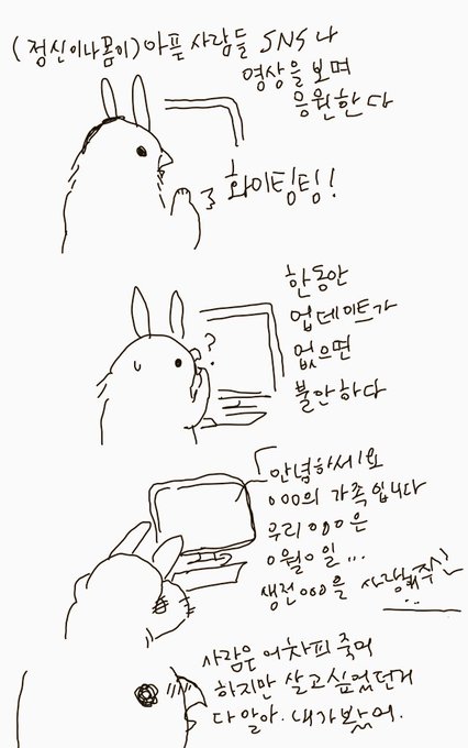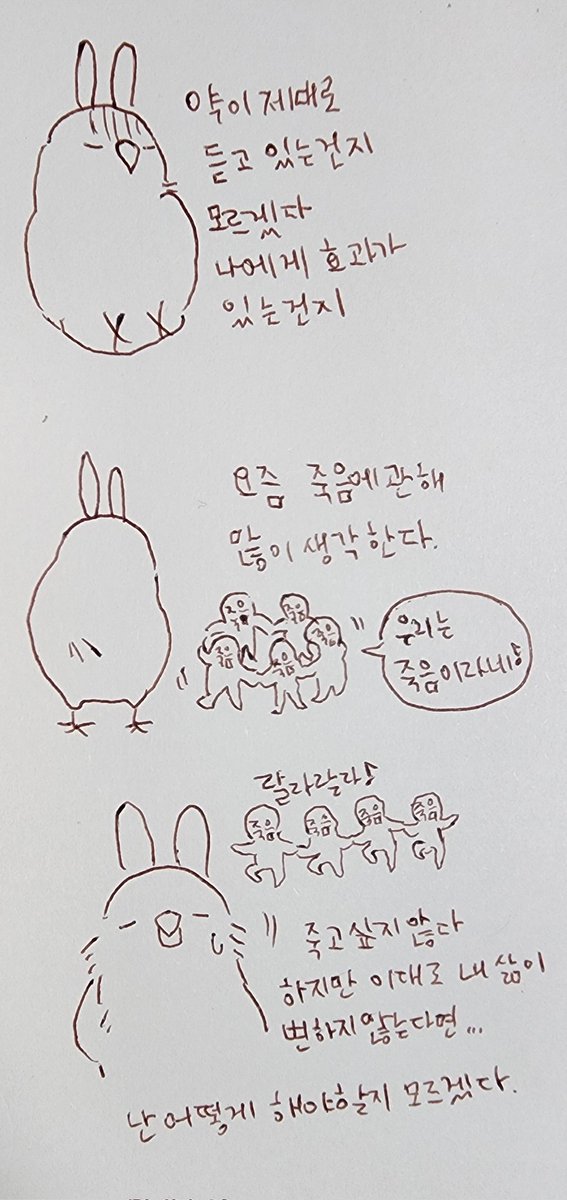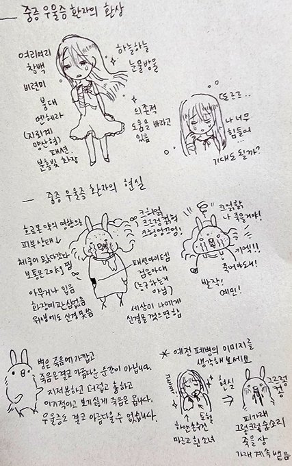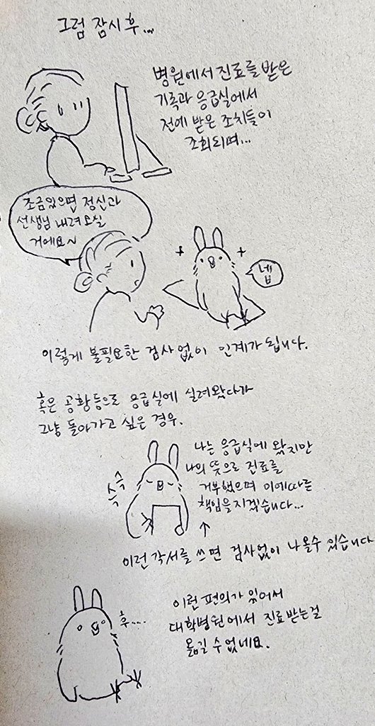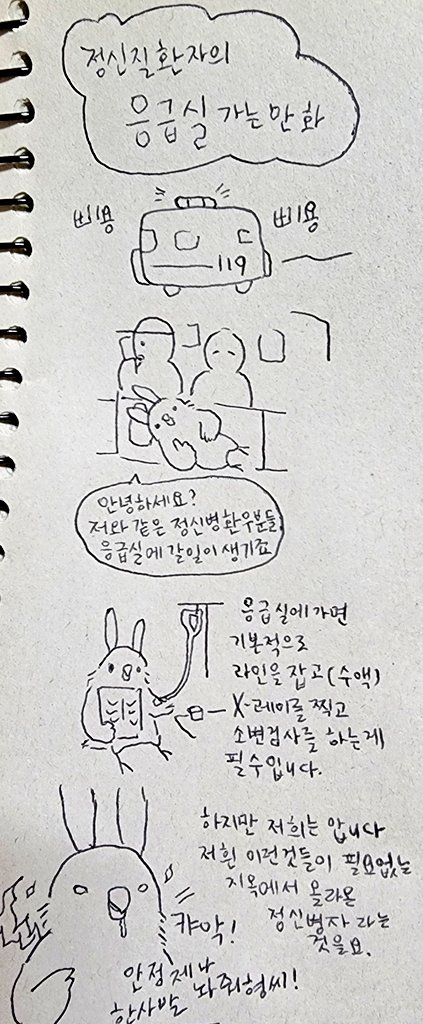 따듯한 말에 침대에서 벌떡일어나 그려본 응급실가는 만화입니다. 실제로 응급실에가면 누구나 기본검사와 조치를 하게됩니다. 하지만 이런 방법으로 저는 기본검사, 라인을 잡지않고 비상약을 처방받을수 있었습니다. 아이쿠 공황이 오는 동안 괜찮아졌네의 상황에서도 쓸 수 있습니다. 정신과 응급실