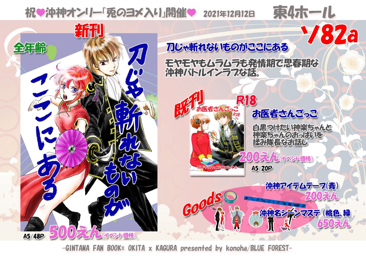 12/12兎ヨメ発行予定の新刊です。スペ:ソ82a 憧れていた乳になれて絶好調な神楽だが沖田は冷たい態度。神楽は沖田の気持ちを確かめに行動に移してーモヤモヤもムラムラも思春期な沖神バトルラブな話。 BOOTHの予約はコチラbfkonoha.booth.pm/items/3454335 サンプル1