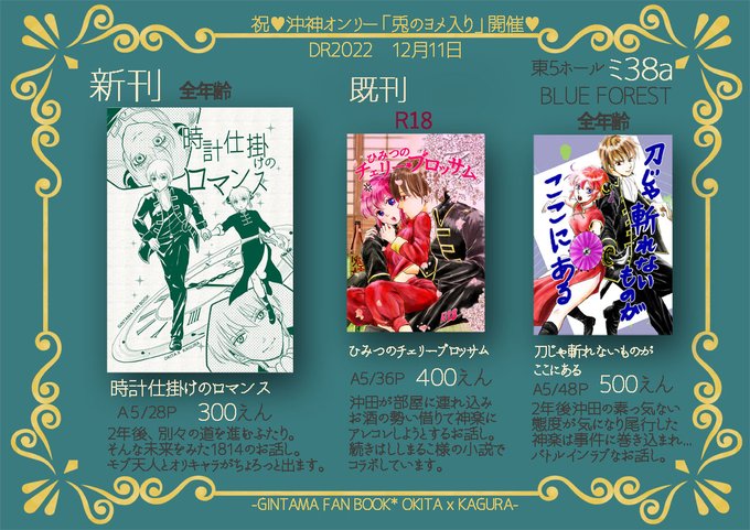 祝♥沖神オンリー開催🥳 【12/11DRF.2022 兎ヨメ】 ミ38a (BLUE FOREST) 新刊サンプルです。三千世界時計で未来をチラ見するお話し。モブ天人とオリキャラが登場します。26P(増えた)よろしくお願いします🙂 通販🐯ecs.toranoana.jp/joshi/ec/item/… booth bfkonoha.booth.pm/items/4359895