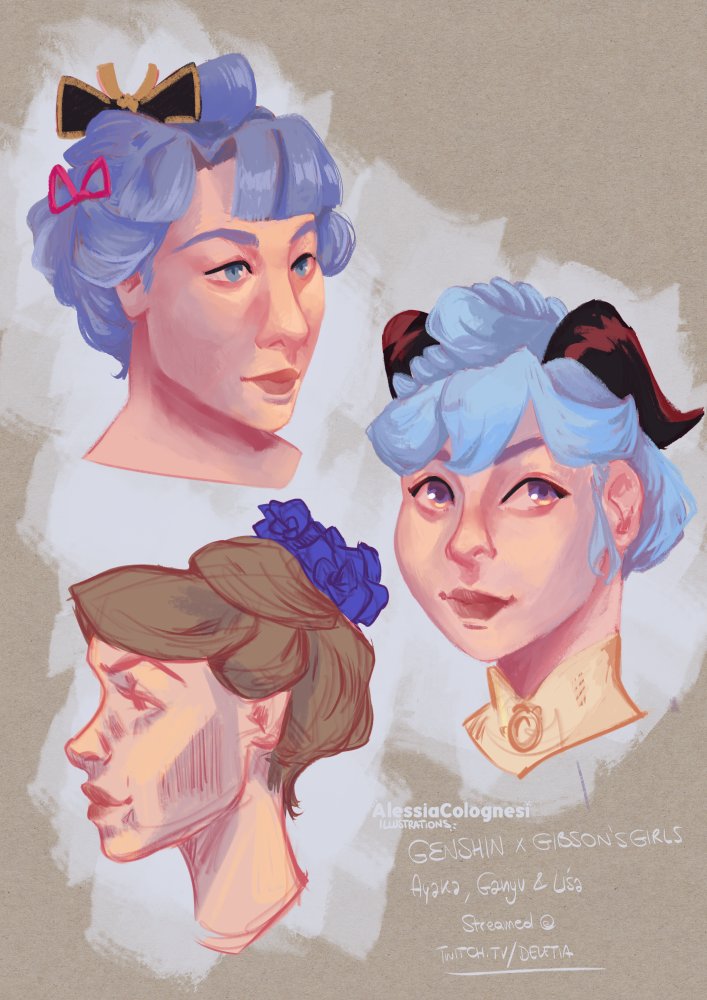 A little wip from today's stream! Genshin Impact's lady x Gibson Girls! I picked my fave babies: Ayaka, Ganyu and Lisa ♥ #genshinimpact #genshinimpactfanart