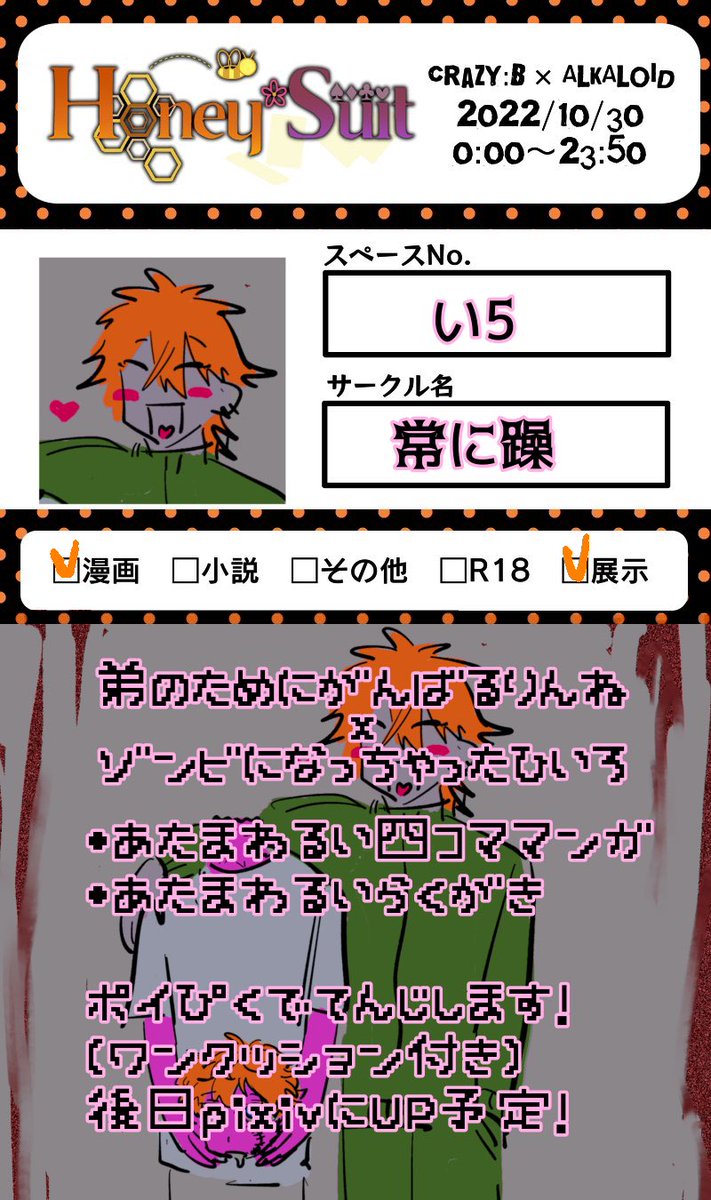 15 30 『Honey*SuitⅢ』燐一で参加します! ちょっとした漫画とらくがきを展示予定です! よろしくお願いします🙇 #クレカロハロウィン 22/10/29 06:01