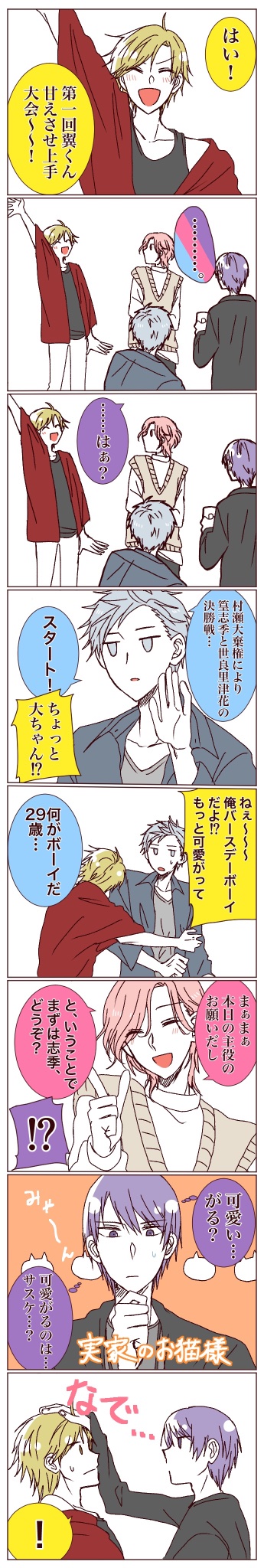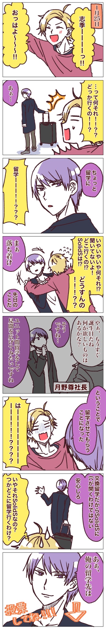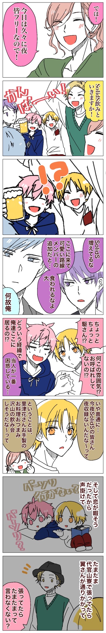 マシュマロよりリクエストいただきました、SolidSと飲み会をする黒年少さんです! 久々にバタバタ系の漫画描けて楽しかったです!! カラー会において最強の七色の駆さんはコミュ強なんだけど、相棒恋くんに対してはちょっとツンデレなイメージです🤔 twitter.com/bigbag_mtd/sta…