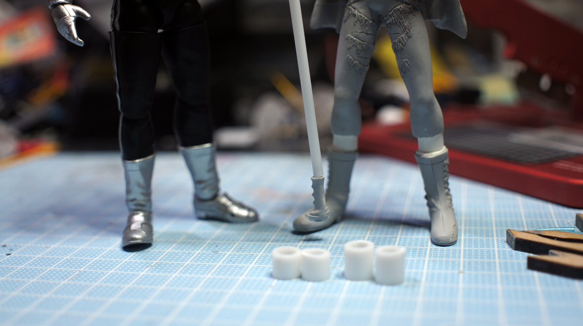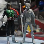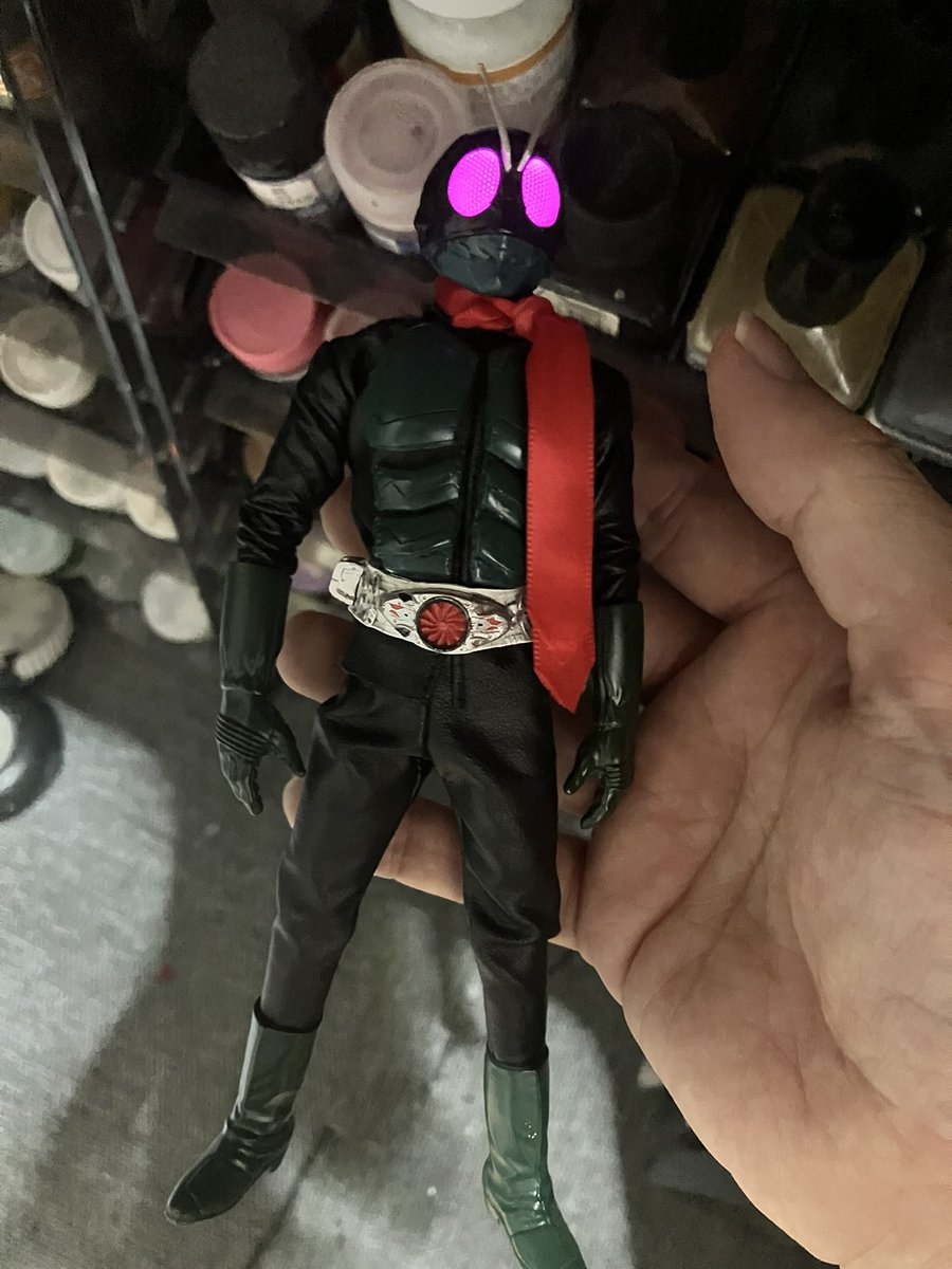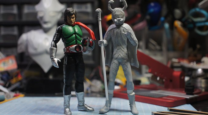 祝ライダー51周年という事で 捨てサフ吹いて様子見👀 やはり、真骨彫と対峙させたいので (旧1号真骨彫早く発売プリーズ) 身長を合わせました✋ 8mm.6mm.と試しにやってみて、 膝の位置見て最終的に5mm延長に パテ盛って調整します #仮面ライダー51周年 #ニチアサフィギュア改造部 #怪奇蜘蛛男