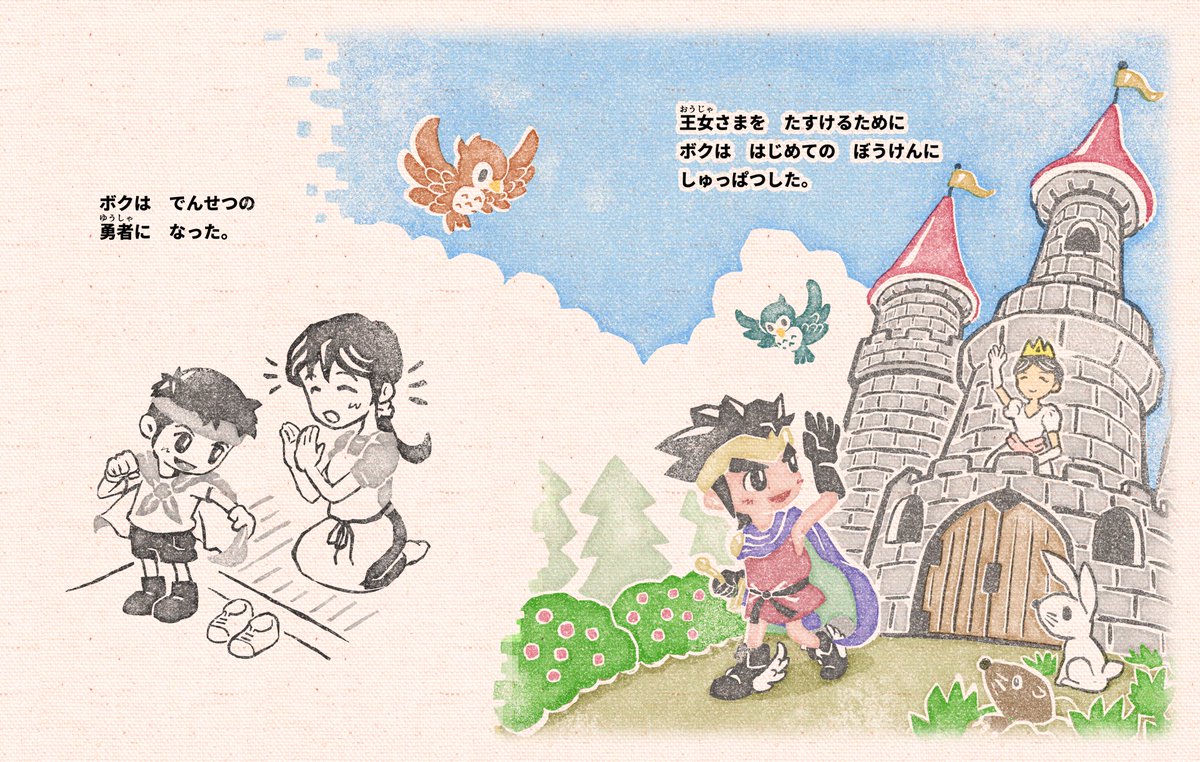 3 15 はじめてのクエストのイラストはスマホで見ても気がつかないかもしれませんが、消しゴムスタンプで出来てます。とは言いませんがそれっぽく描いてます。のでぜひ、大画面のタブレットとかで見てくれたら その可愛さが倍増します。 #Kindle #絵本 #イラスト 23/03/10 12:12