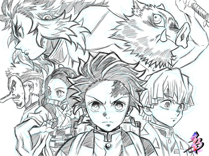 見たこと無いんですが、息抜きに描いてみました😅 敵とか味方とか分からないんで、敵とか味方ゴチャゴチャだったらすみません🙇♂️ 今回はラフ画として作りました😝 #イラスト #ラフ画 #鬼滅の刃 #鬼滅 #デジタルイラスト