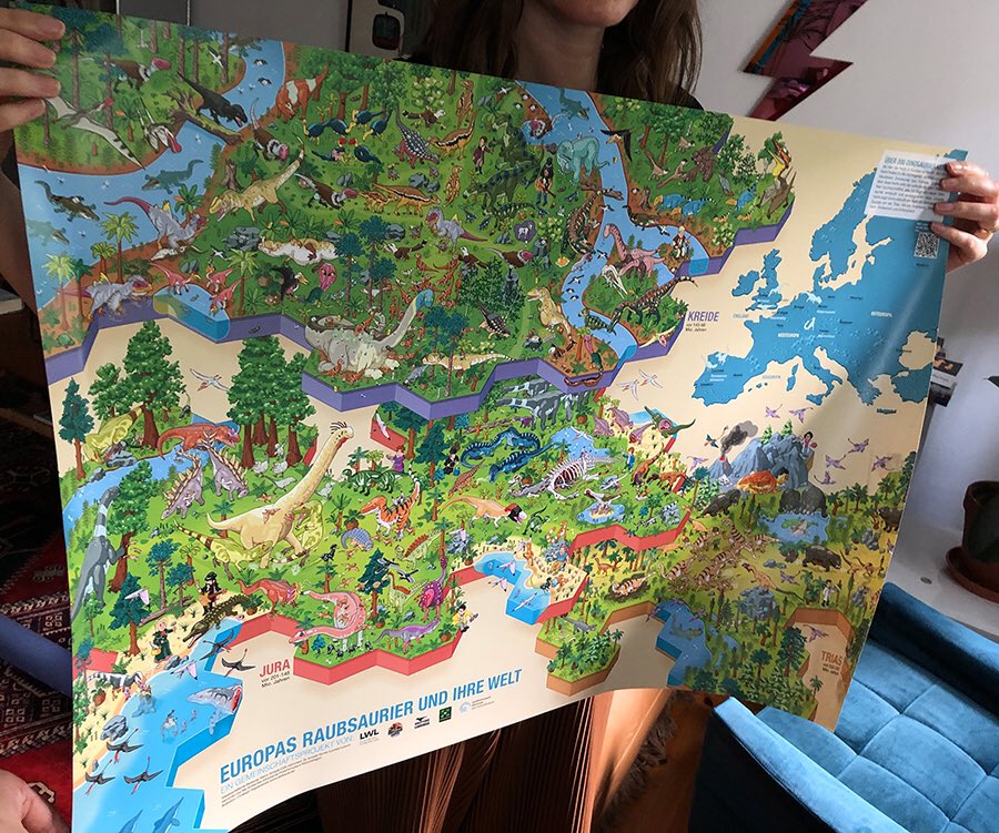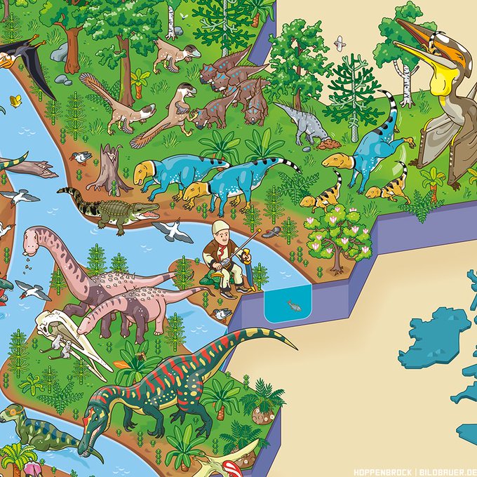 As a tribute to Johanna "Tilly" Edinger (1897-1967), paleontologist and founder of paleoneurology, I drew her in my new #illustration about Europe's #dinosaurs for Dinopark Münchehagen! #womeninscience #paleoart #illustrator #wimmelbild #sciart #scicomm