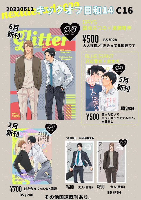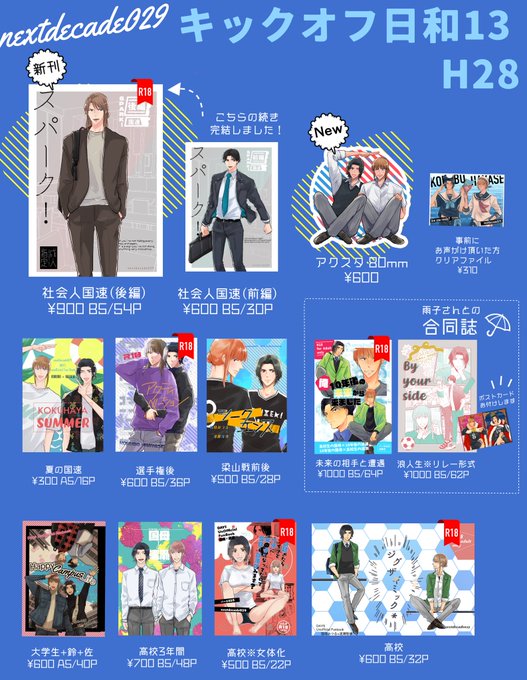 キックオフ日和13お品書きです! 新刊サンプルはこちら pixiv.net/artworks/99821… 既刊サンプルは引用RTツリーを参照ください 万が一取り置き希望あったらDM受け付けます~🕺(新刊はたくさんあるのでまず大丈夫ですが既刊とアクスタは数限りあります) twitter.com/birth029/statu…