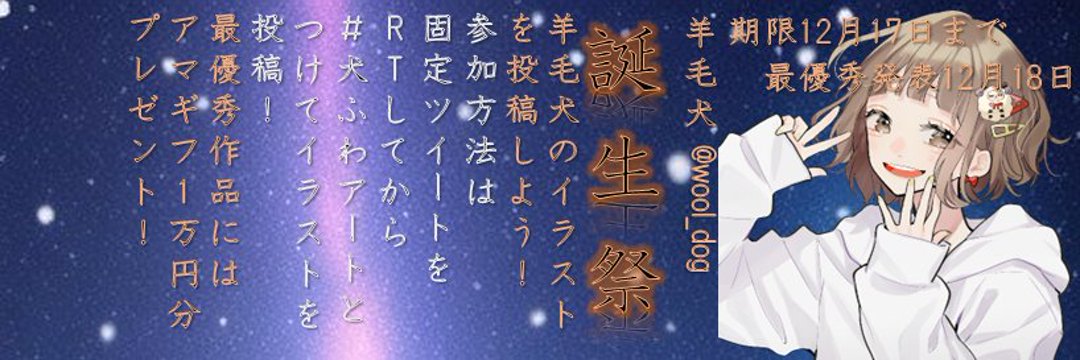 アマギフ1万円プレゼント企画!? 羊毛犬 誕生祭を開始します! 参加方法は簡単 このツイートをRTして 羊毛犬@wool_dog を描いて #犬ふわアート とハッシュタグをつけるだけ! ポーズ、髪型、背景、服装なんでも自由! 最優秀作品1名にアマギフ1万円分! #イラスト #イラスト依頼 #一万円