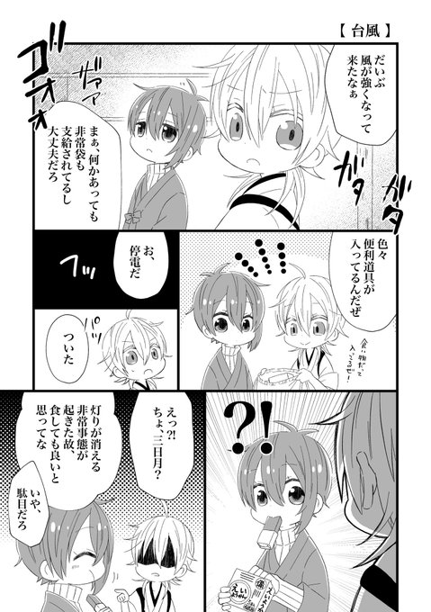 24 82 #つるみかワンドロワンライ1week1本勝負 お題「台風」 1週間の遅刻参加失礼します💦 甘味があると行動が早い三日月🌙 21/08/08 16:00