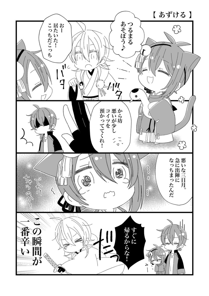 37 178 #つるみかワンドロワンライ1week1本勝負 お題「あずける」 過去お題お借りしました!今年初のワンドロ参加させて頂きます🙏✨ ※三日月だけにゃんです。 23/02/26 22:55