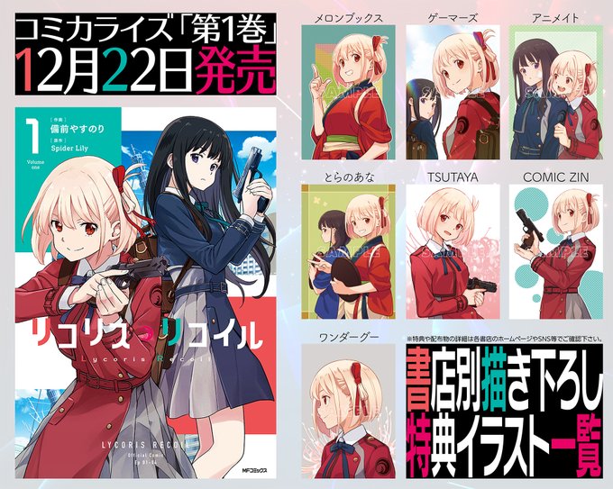 300 1310 来週22日は、いよいよ【リコリス・リコイル】コミカライズ版コミックス第1⃣巻の発売です❗ 書店別特典のイラストもたくさん描き下ろしました✏ 一覧にしましたので…購入の参考にぜひ✅ #リコリコ 22/12/16 23:13