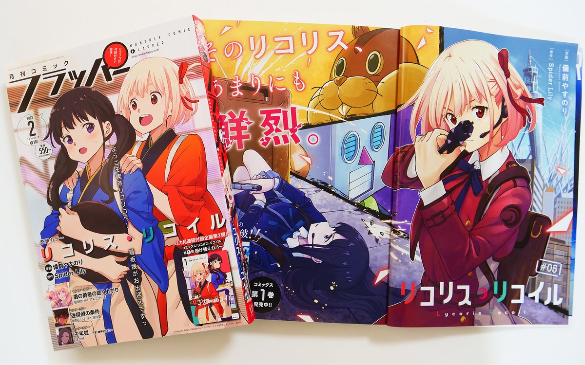 107 390 📚雑誌情報📚 ☕️リコリス・リコイル🍡 コミカライズ版 第5⃣話 掲載 『コミックフラッパー 2023年2⃣月号』 🐿️本日発売🐿️ ✅#リコリコ 表紙&巻頭カラー🎊 ✅付録は【コミックス第1巻の掛け替えカバー】です🎊 23/01/05 13:39