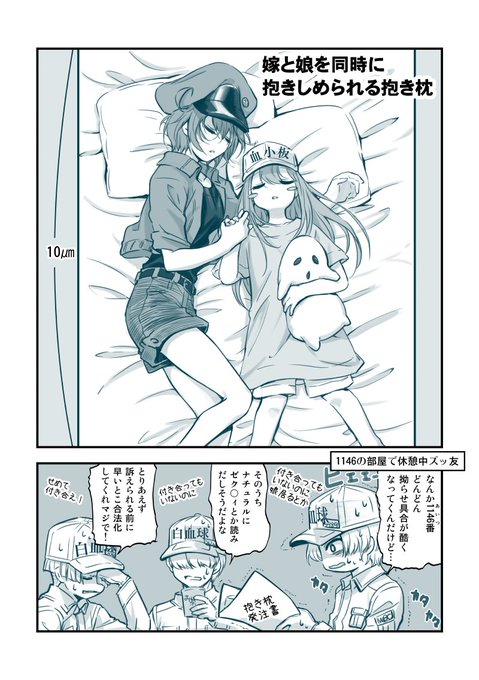 118 625 血球家族→嫁&娘抱き枕とかどうだろう、と思って絵だけのつもりだったのが、なんか降ってきたので漫画に。 白血9さんが出て来ない上変態紳士ですみません。 18/12/15 18:45