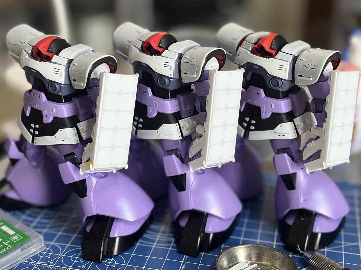ドム工場🏭 腕進捗! 先ずはプラ板で作った追加装甲のサイドの形を決めていきます☝️ 大量生産中┏○ペコ #ドム #ガンプラ