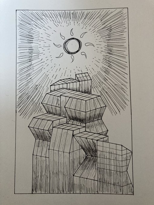 一点に意識が集中するような絵を描きたかったら初挑戦♪ 変わった形の建物と太陽を描いて、線画と影の練習にもなったかな… チョットシッパイシタケド タイトル「太陽」 #絵描きさんと繋がりたい #イラスト練習中 #イラスト好きさんとつながりたい #ミリペン