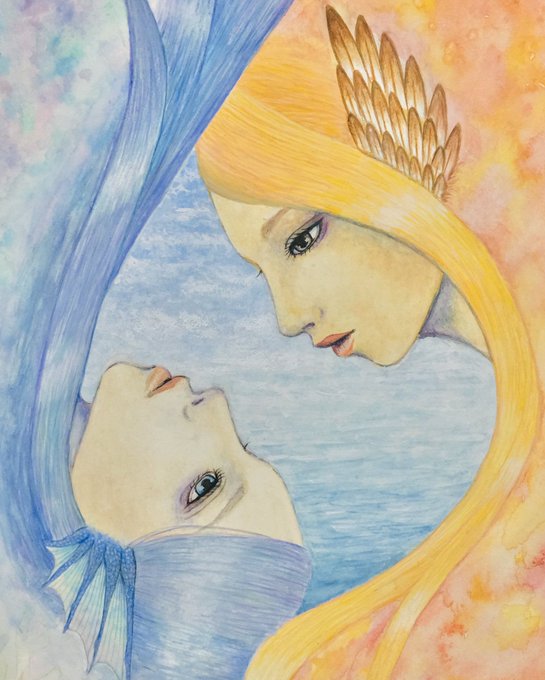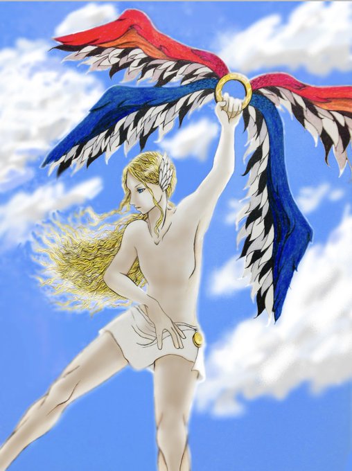 #色鉛筆 #イラスト #ギリシャ神話 イカロス 昔に描いた色鉛筆イラストに空を付けただけの代物
