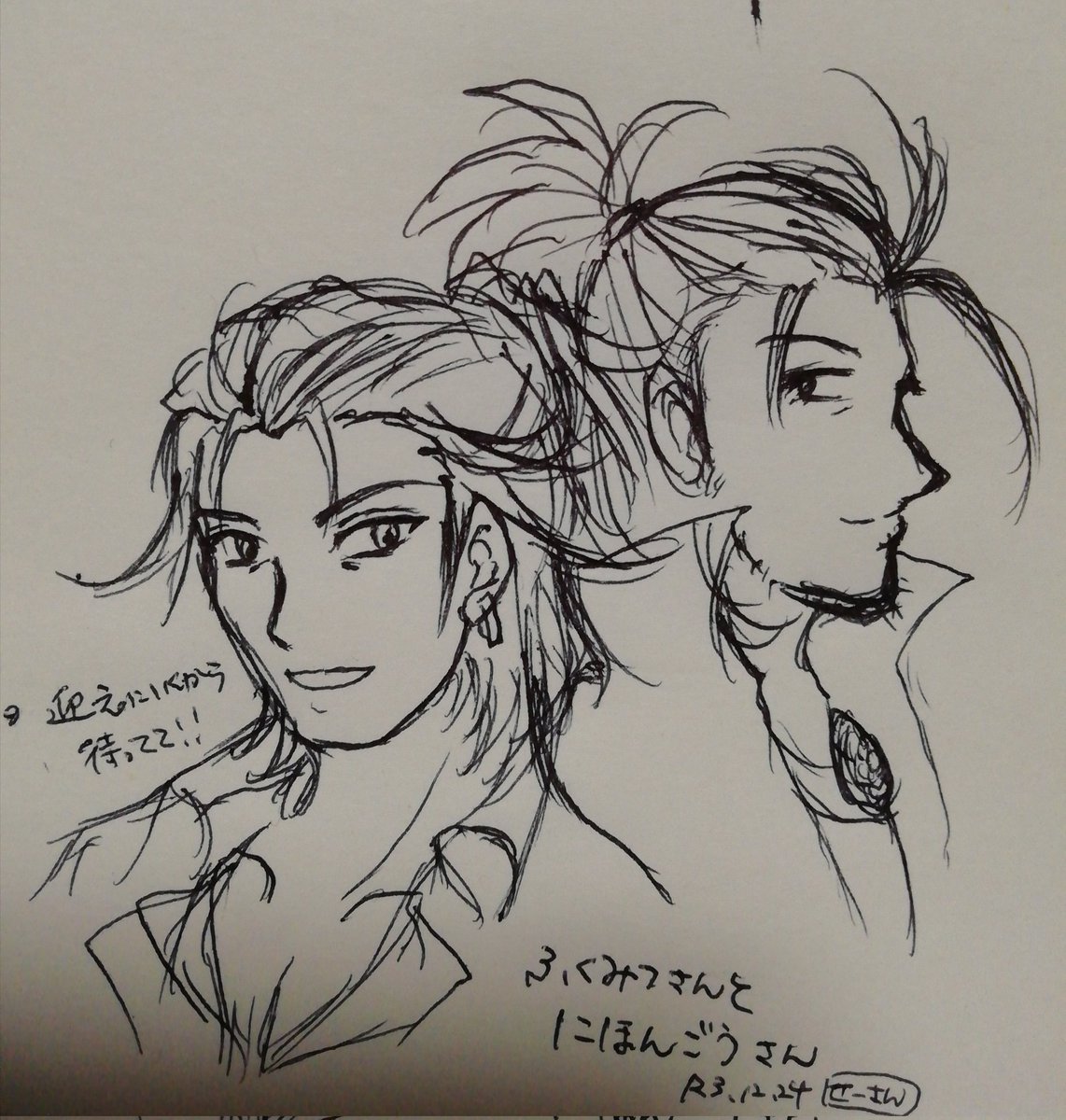 #10月3日は天下三名槍の日 複数描くの苦手な上にアナログ鉛筆で描けるけど、消しゴムがないので一発勝負というあまりにもあんまりな落書きですがお祝いしたいので! 三人描いたからえらい!と自分で思っておきますw