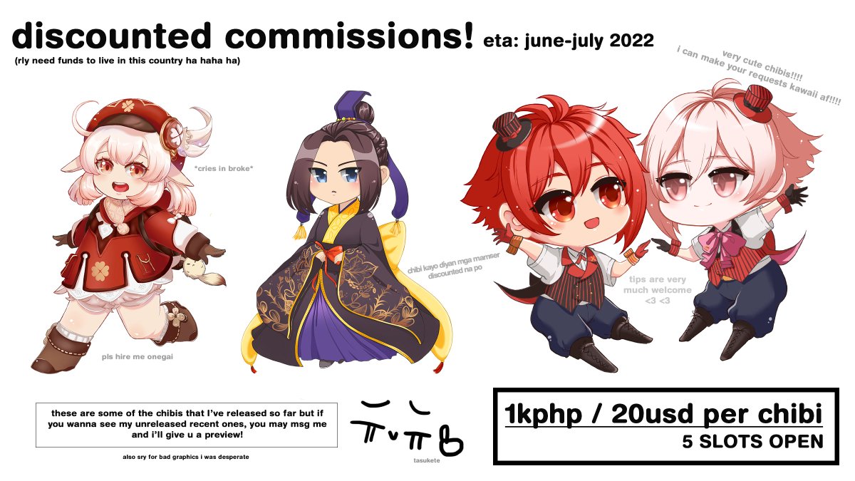 i still have an ongoing comm but i'm gonna finish it this week so posting this earlier! [COMMISSIONS OPEN] Hello! I am an artist from PH and would really appreciate your help qwq Opening 5 slots for full body chibi ETA: June - july 2022 #commissionsopen#PHartist#artph