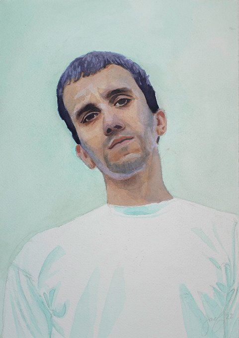 #84 Aquarel·la amb paleta limitada a dos colors. Justin Broadrick de Godflesh i també exmembre de Napalm Death. #JustinBroadrick #Godflesh #Napalmdeath #metal #extrememetal #industrialmetal #grindcore #watercolor #watercolorportrait #portraitpainting