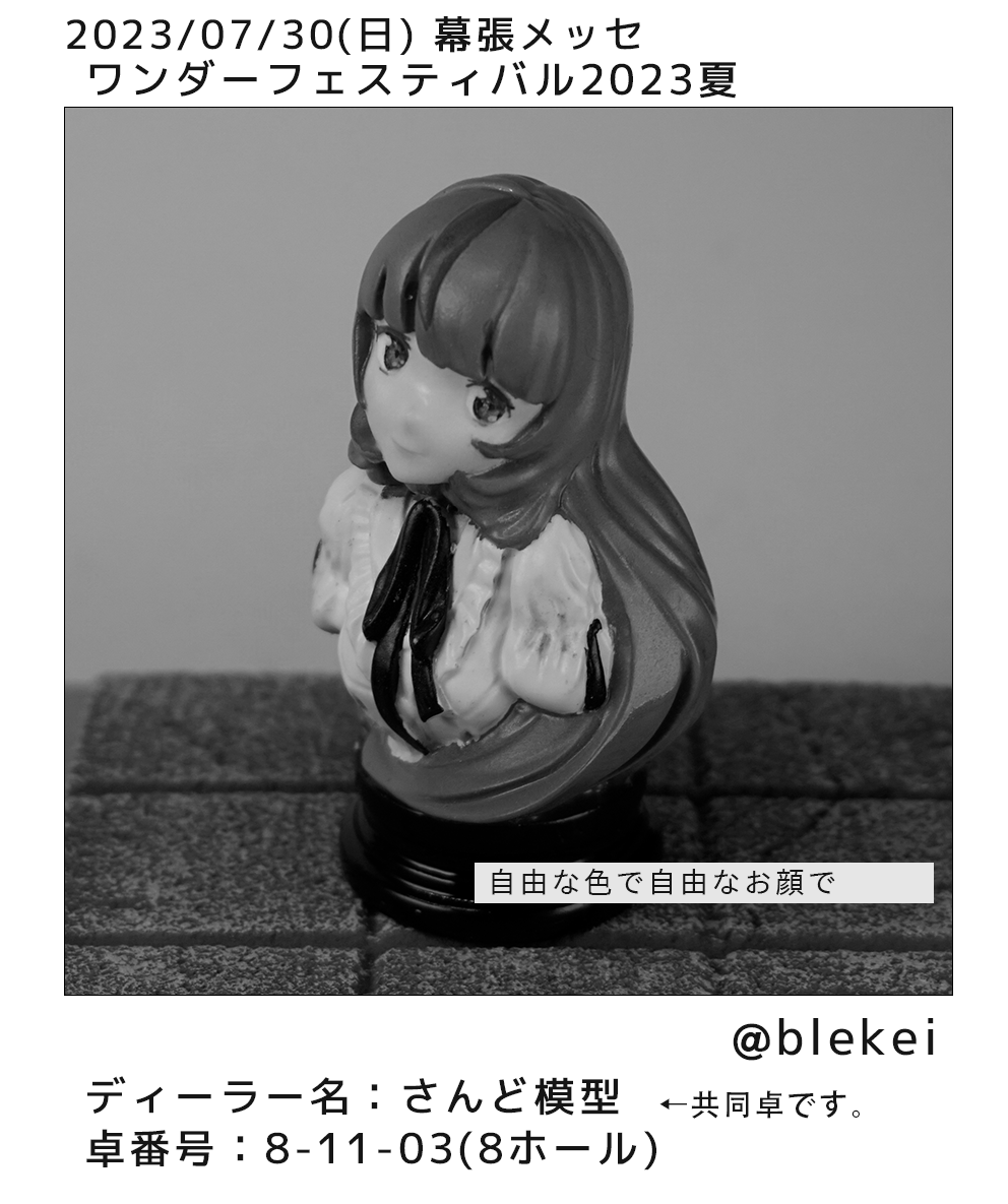 2023/7/30(日)幕張メッセ ワンフェス2023夏 卓番:8-11-03(さんど模型、相乗りしてます。) 出展物:オリジナル(8cm) お好みのお化粧、色で塗って頂けると嬉しいです。 そのままでも良いし、フィルタリキッドばしゃっとしても良いと思います。 #WF2023S #WF2023夏 #WF2023Sおしながき