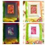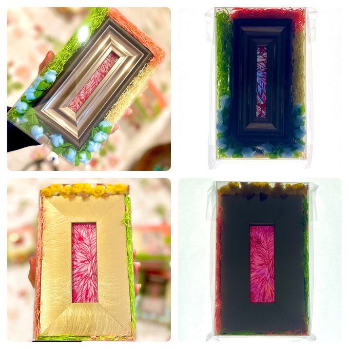 自作+市販の混ぜ物インクと硝子ペンで描いた一枚絵を切り分けて、箱に閉じ込めた原画たち。 吊り金具付きで壁にも掛けられるし、箱のままだと自立して机に置けて、後ろから光を当てると色が変わります🤗 只今プレゼント企画中ですのでこの際に是非✨ #作品を載せて自分の作品を知ってもらおう twitter.com/blnk_o/status/…
