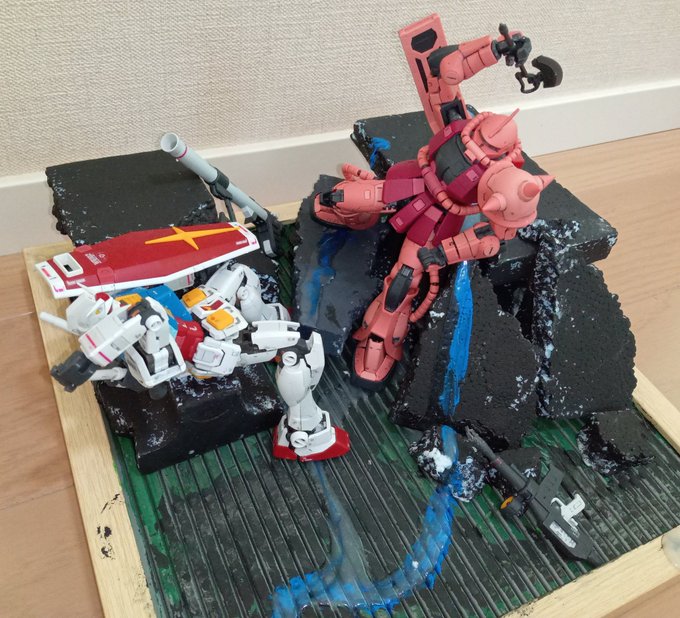 息子作3号 どうしてもジオラマが作りたかったようで、100均でなんか買って作ってました。 小5の作品なので、どうか暖かい眼差しで。 #ガンプラの画像を貼るとRTされると聞いて #ガンプラ好きと繋がりたい #ガンプラ