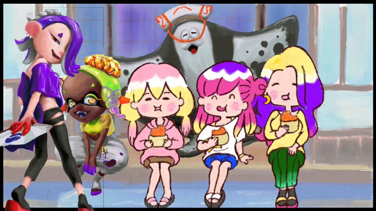#今月描いた絵を晒そう すりみ連合を描いてみたけど、背景描くの面倒くさくなって、テキトーに合成ばかりしてた🤫