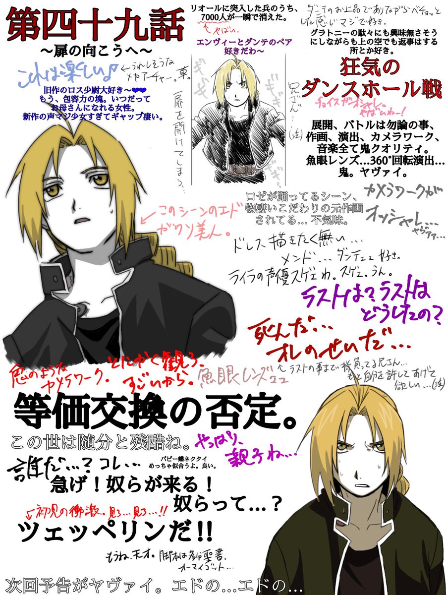 旧鋼の錬金術師見ろ。 第四十九話 ダンスホールが終点とは、上出来じゃないか、みたいな。クソオシャレ。作画がキレッキレに猛威を振う。絵コンテ描いた人誰?あのカメラワーク考えたの誰??旧鋼の最終回近くの作画ヤベェんよ。新作は見習って下さい。新の最終回、落書きみたいな作画で母に笑われた