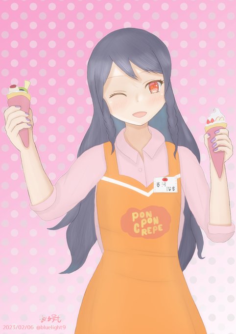 12 42 マイキャラちゃんポンポンクレープイメージガール概念…… (湯るねさん(@rune_yu)家の瑠音ちゃんを描かせていただきました) 23/02/06 23:57