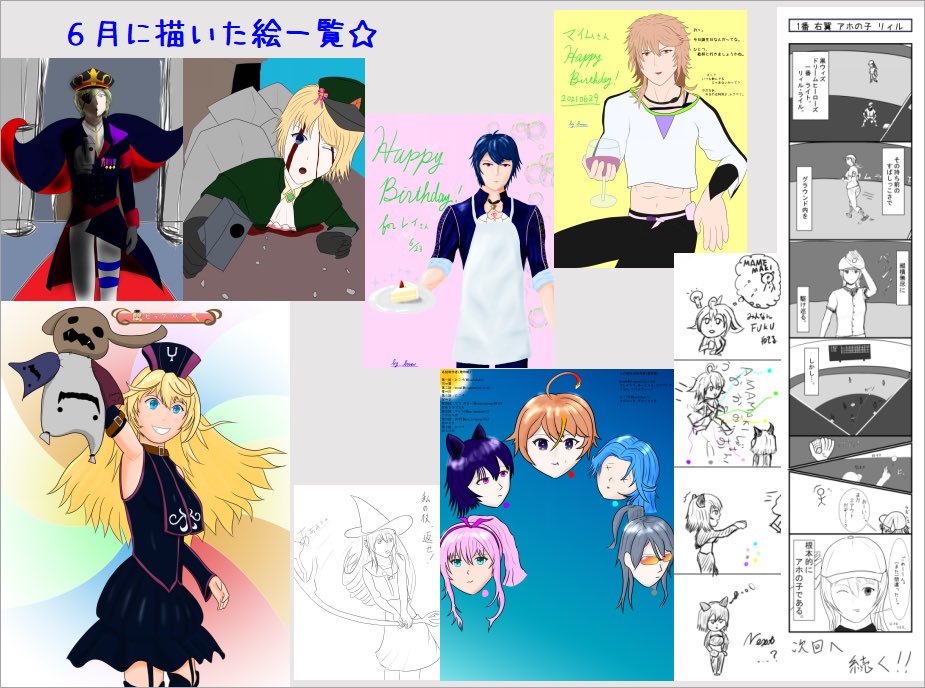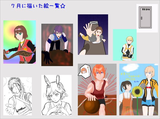 #今月描いた絵を晒そう 今月はなー、いろいろやっててなー、忙しかったからなー あんまり描けてな……いや?そうでもないな?← あれれぇ〜?思ったより描いてるぞぉ〜?← 誕生日絵とかで稼いだな…? ところで、カラー絵の共通点に気が付いたぼくはとても笑いました← Q.共通点何でしょう?←