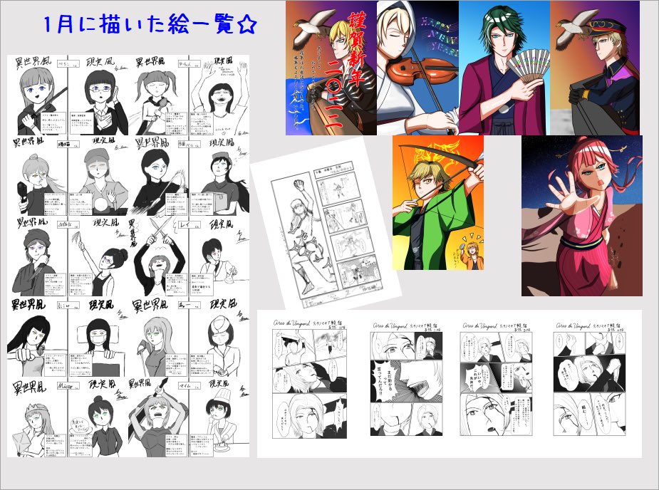#今月描いた絵を晒そう 今月はなー、あんまり描いた記憶がないなー ……あれ?こんなに描いてたっけ??← 塗った記憶ないから描いてないと思ってたけど、ラフ大量生産してましたね…漫画とか… これに加えて先日、トレス練習を7枚してますね…←← (上げた日の関係上、年賀絵は一月絵扱い)