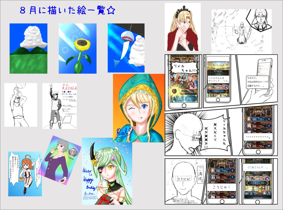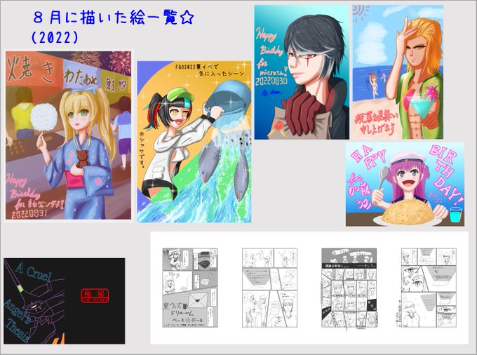 #今月描いた絵を晒そう 久々に はちがつぶん ジャンルごった煮 サマポケ・FGO・黒ウィズ・エヴァ 漫画から厚塗りまで← 漫画はここじゃちょっと小さいので、#黒ウィズドリームベースボール で検索すると読めます← 去年どうだったっけな?って確認したら、去年も漫画描いてて草生えた←