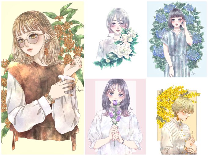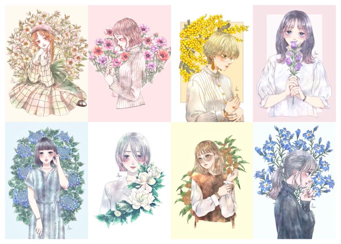 #2021年の絵を振り返る 今年は8枚描きました…こんなに描いたの初めてです😳 お花×女の子シリーズでイラスト集を作るのを目標に描き続けた1年でした💐来年には形にできるよう頑張ります☺✨ 皆様良いお年を🎍✨来年も宜しくお願いします😌💖
