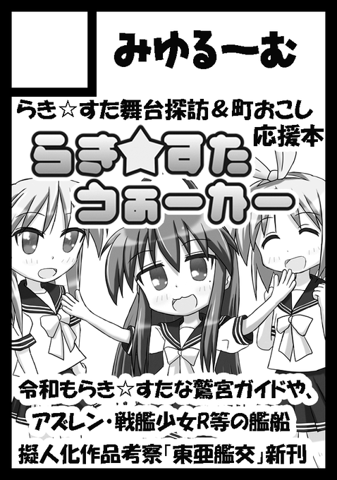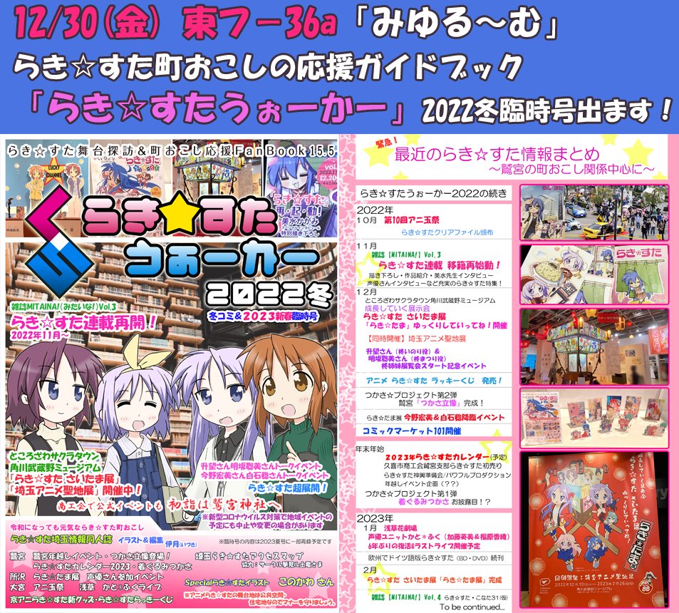 らき☆すた町おこし応援同人誌「らき☆すたうぉーかー2022(夏)」 C100-1日目(土)東Z-42a 「みゆる〜む」にて頒布開始予定です! C100記念らき☆すたクリアファイルも会場頒布予定 #C100WebCatalog #C100 #らきすた