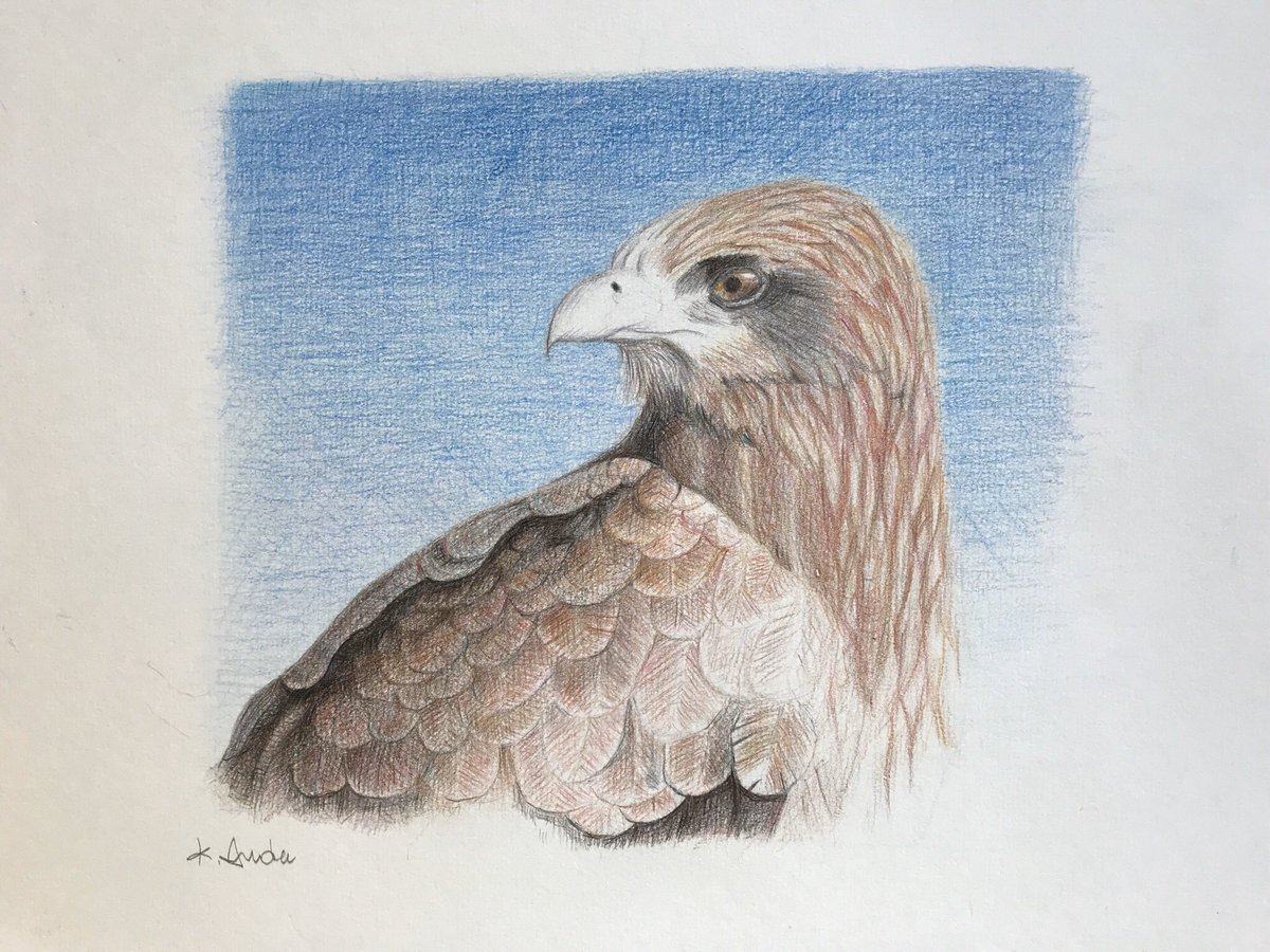 前に描いたトンビの絵💕 バックに青空入れました🌈 この絵をほのすけに見せると、逃げて行きます💦 怖く見えるようですw😆 #色鉛筆画 #イラスト #野鳥